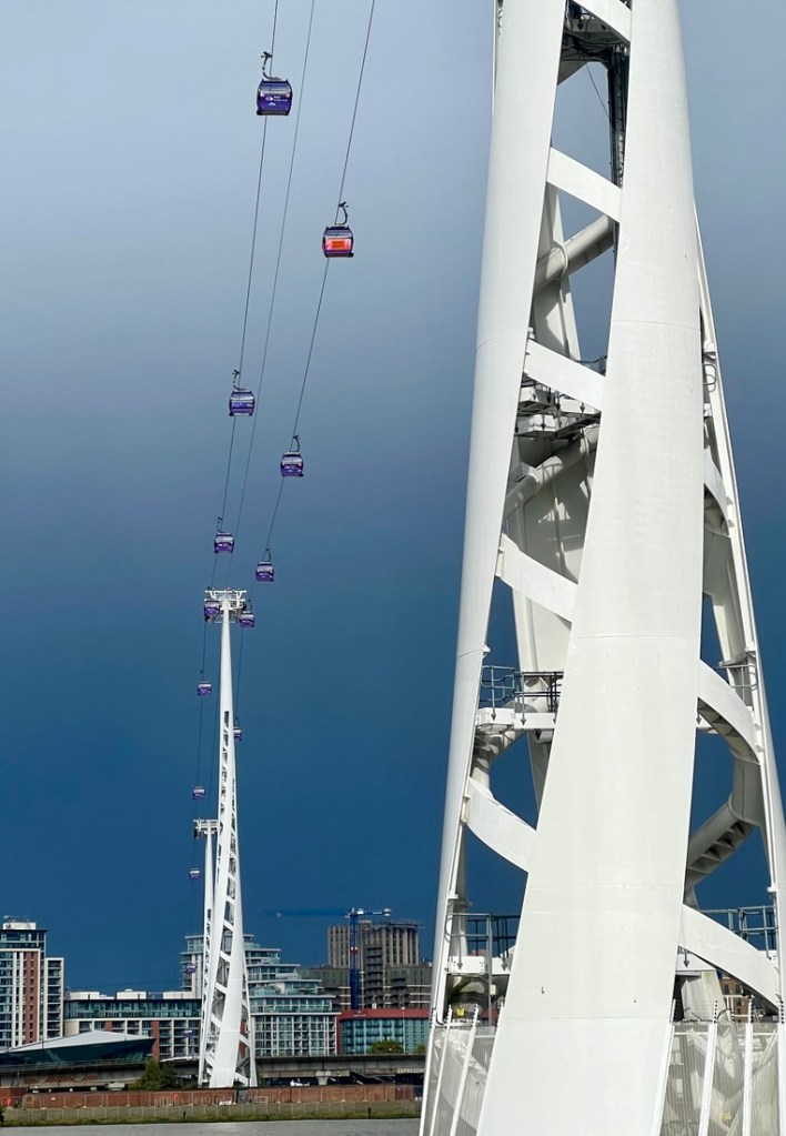 Welcome shelter from the storm.On the heavy rain, I passed this marker of the prime meridian.The Uber boats were in a row!These gondolas over the river were stationary because of the storm. I did not want to ride in one, and could not imagine what it would be like being stationary for so long. The O2.