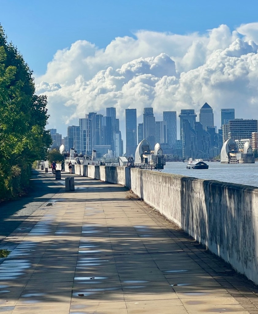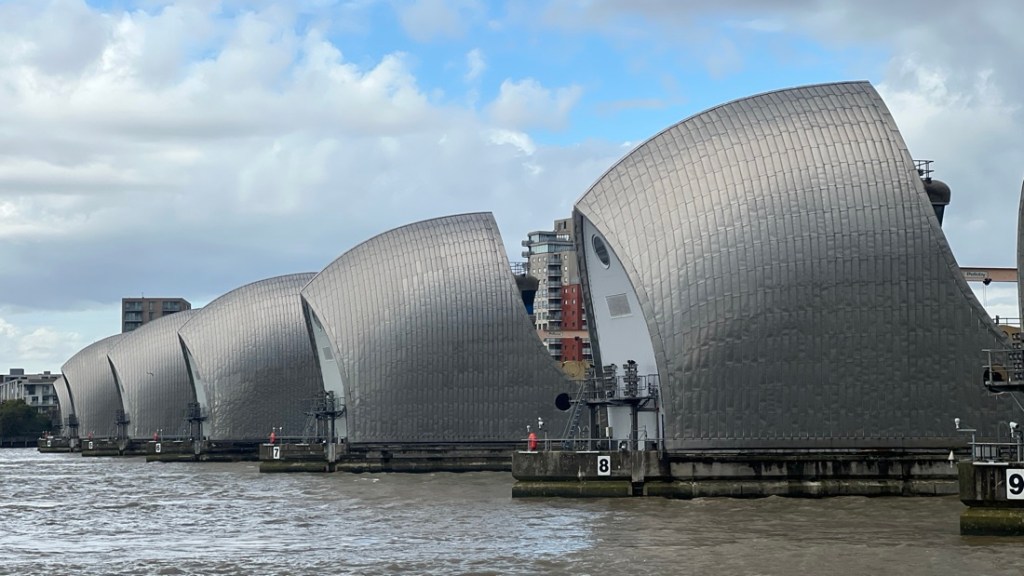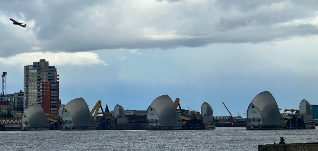 As we rounded the tip of the Greenwich peninsula next to the O2 Arena, the heavy rain and strong winds started. Luckily, we were right next to the O2’s Intercontinental Hotel and conference centre and there was a route off the path to its welcome shelter. We went into a door for a Gartner CFO conference, and were greeted by, “do you have a lanyard?” Looking like drowned rats, we were directed to the hotel’s concierge who helped get a taxi. Janet, Keesha, and Eric were cold and worried about getting colder, but Peter really wanted to see the Thames Barrier. Fortunately, the worst of the storm, including lightning, passed while we were under cover, and Peter then headed off eastward.