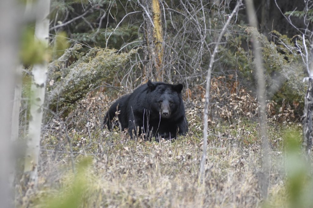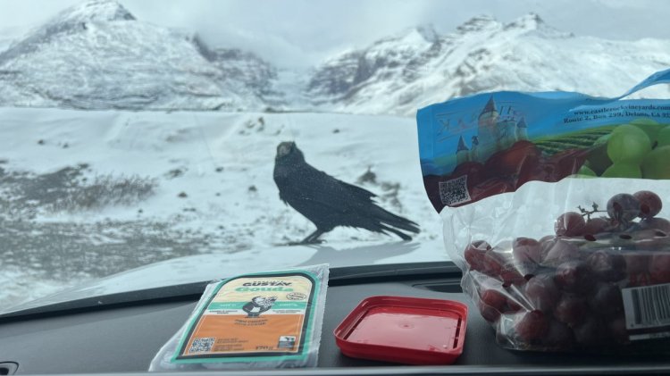 The river was a long way below the top of the rocks.We spotted a cave on the hillside – perhaps the closest we got to seeing a grizzly!Our turning around point was the Columbia Icefields. The Athabasca Glacier is the source of rivers that flow into the Pacific, Atlantic, and Arctic Oceans. We sat in our car to enjoy our picnic lunch, and resisted feeding the begging raven, though we think he was also enjoying the engine’s warmth.I asked Samuel and Kylie to pose for this photo.Walking down from the photo spot was a little more tricky!The wind was so strong that it gave the raven an interesting hairstyle!On our way back to Lake Louise, we pulled off on The Big Bend.On our way back to Lake Louise, we stopped at the Crowfoot Glacier, though we could not work out how it looked like a crowfoot.Near the Saskatchewan River Crossing, a group of stopped cars showed us that this black bear was closeby.