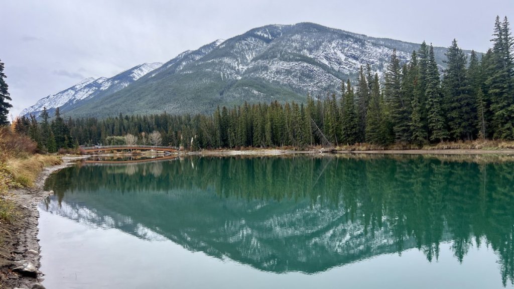 Our visit had to start at the Banff sign!The most convenient parking was at the train station. Everywhere had amazing views!We followed a path along the Bow River.Beautiful! It wasn’t too cold – yet…The British monarch is Canada’s head of state as it is part of the Commonwealth, so there were references to the Queen. We did not see any reference to King Charles!Above us was the cable car station that we would visit that evening.It was a fine hike to Bow Falls.