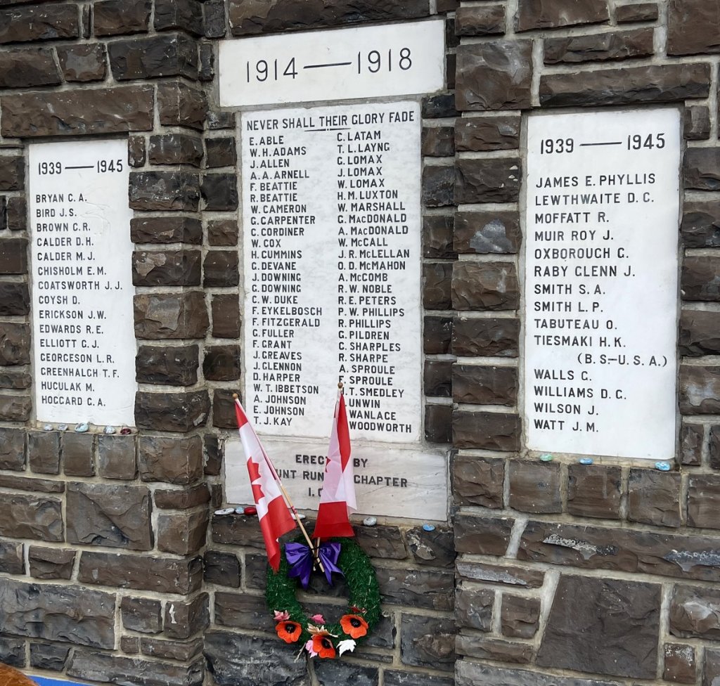 Back in town, this war memorial reminded me of English towns. Elsewhere on this trip, we saw WW1 memorials but not WW2. Surprisingly, WW1 had a greater impact on Canada. There were great views of mountains everywhere, and we did not eat here!!