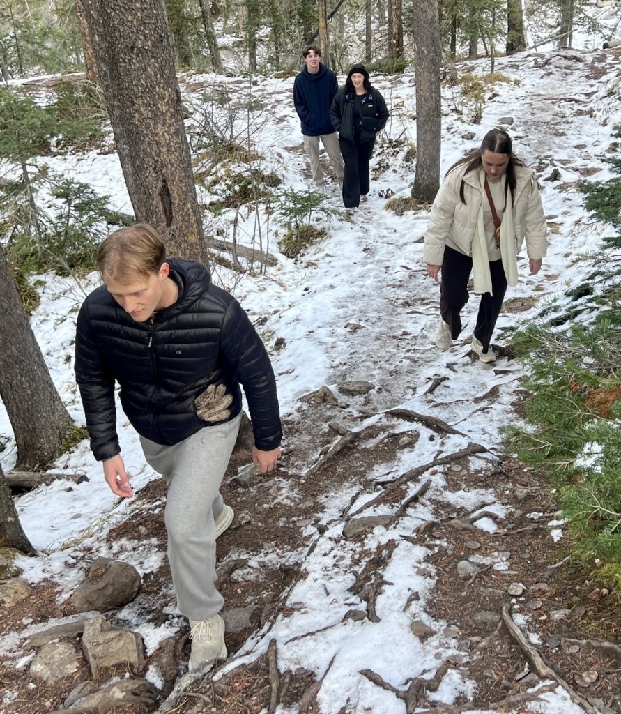 It was an easy stroll around the lake.The path took us up Stewart Canyon.The trail was snowy and slippery at the turnaround point. We were deep in the forest and were carrying bear spray but we saw very little wildlife and no large animals.A happy crew enjoying the hike.As always, there were beautiful views!