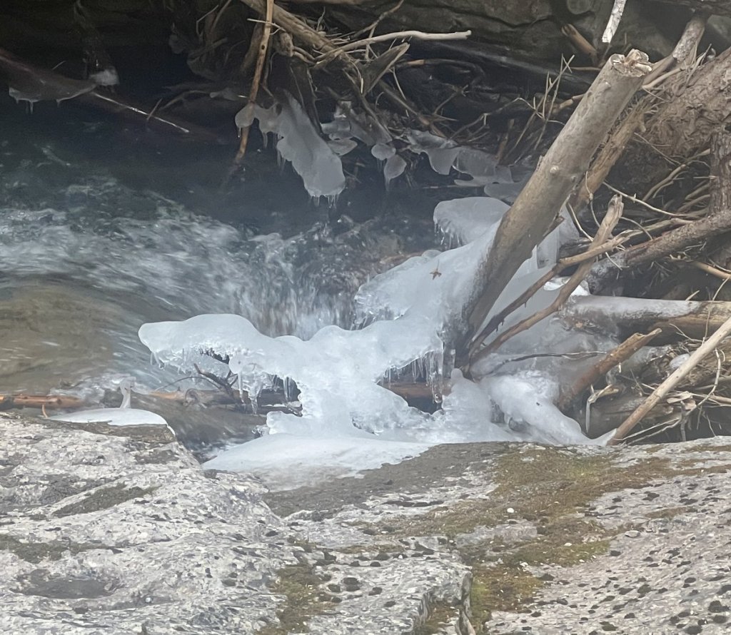 The walkway on the edge of the canyon.We hiked as far as the lower falls.Some ice remained on the river from the last freeze.