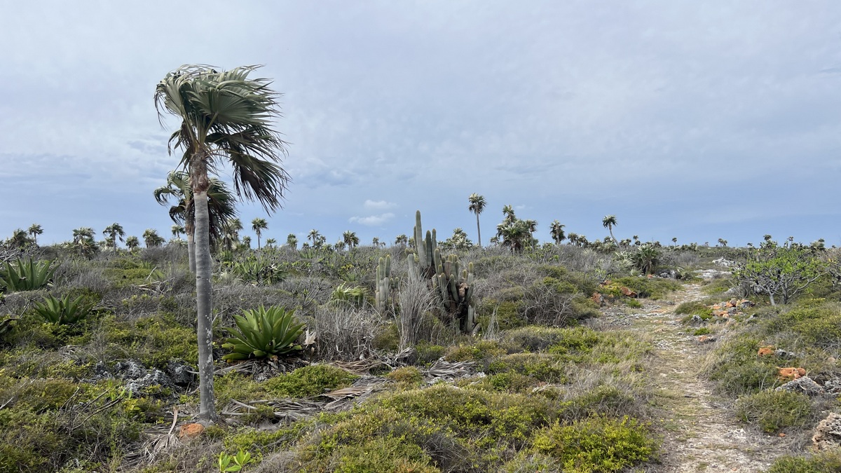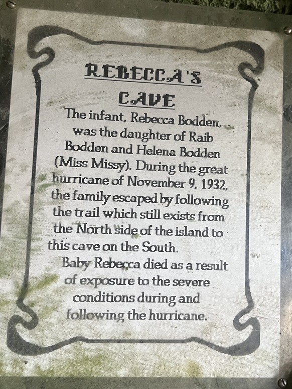 On the southern shore, we visited three caves: Rebecca’s, Bat, and Great. Rebecca’s Cave was named after an infant who died in the 1932 hurricane and her grave was inside. We enjoyed watching crabs scurry on the floor. At first, we didn’t notice the bats. There is a hiking trail across the island at this point.