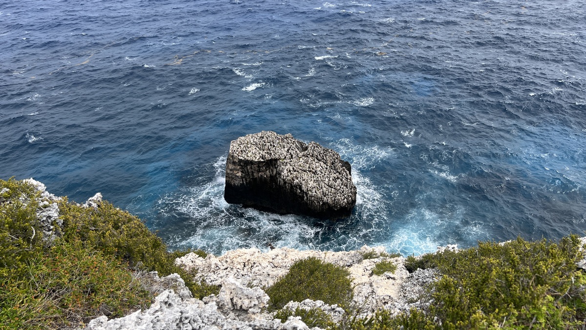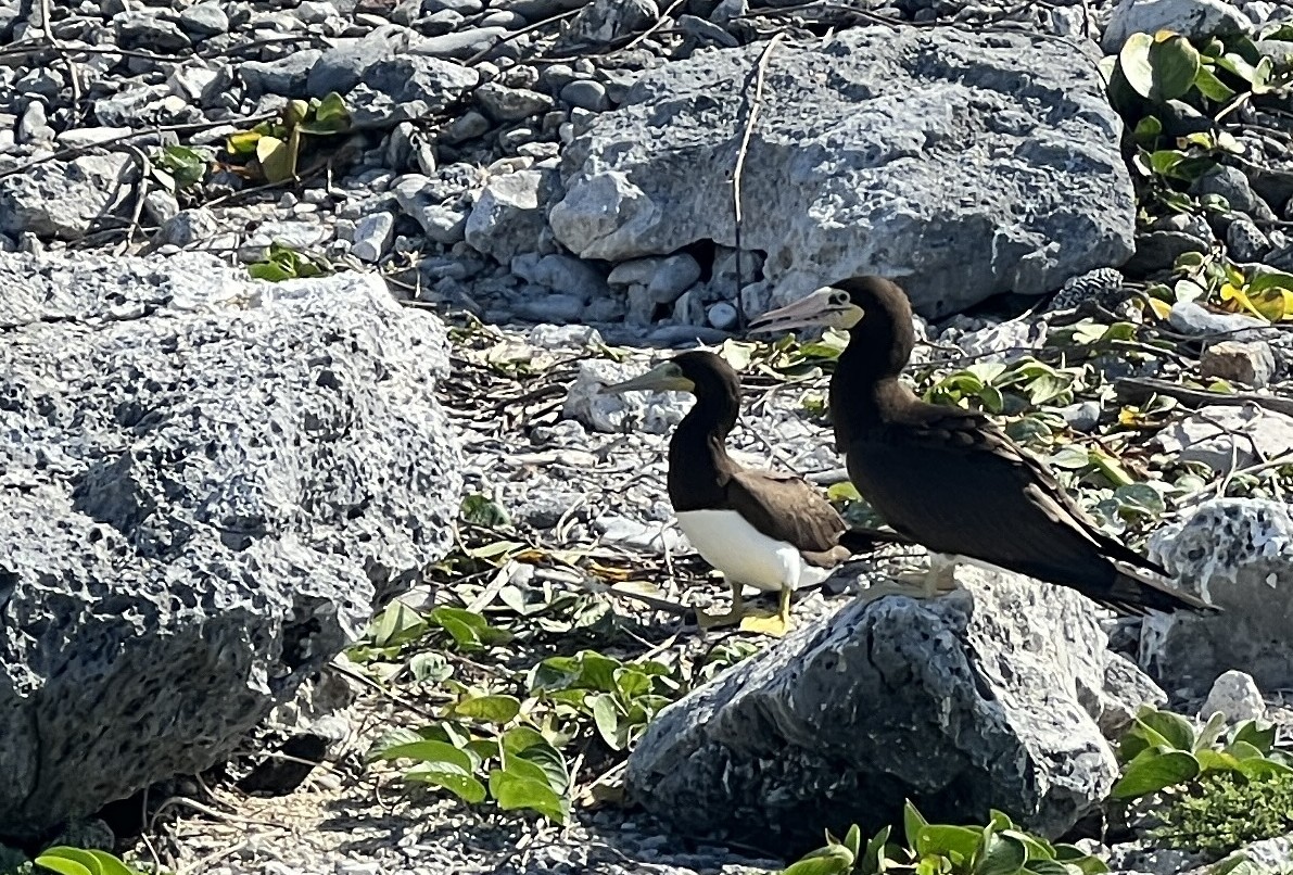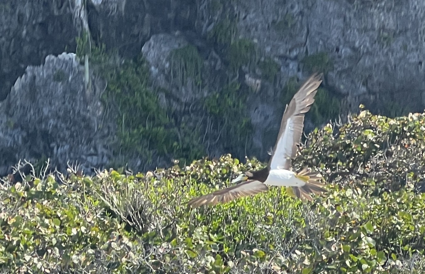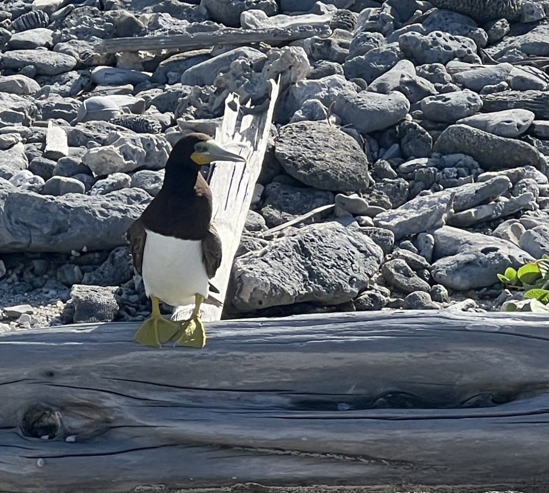 Lori encouraged us to explore Long Beach on the island’s northeast corner. The Boobies had moved from nesting on the cliff to on the beach. While the beach was as rocky as the Blowhole’s beach, it felt more exposed to the prevailing winds, and the array of plastic trash on the beach, most likely swept in from offshore, was eye-opening. At the end of the beach is a small rock, separated from the mainland, known as Little Cayman Brac, which we also saw from above while walking to the lighthouse on the top of the bluff.