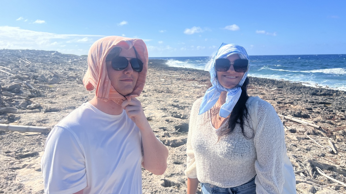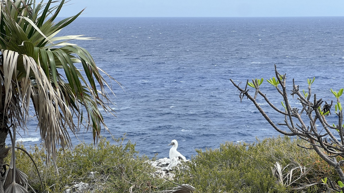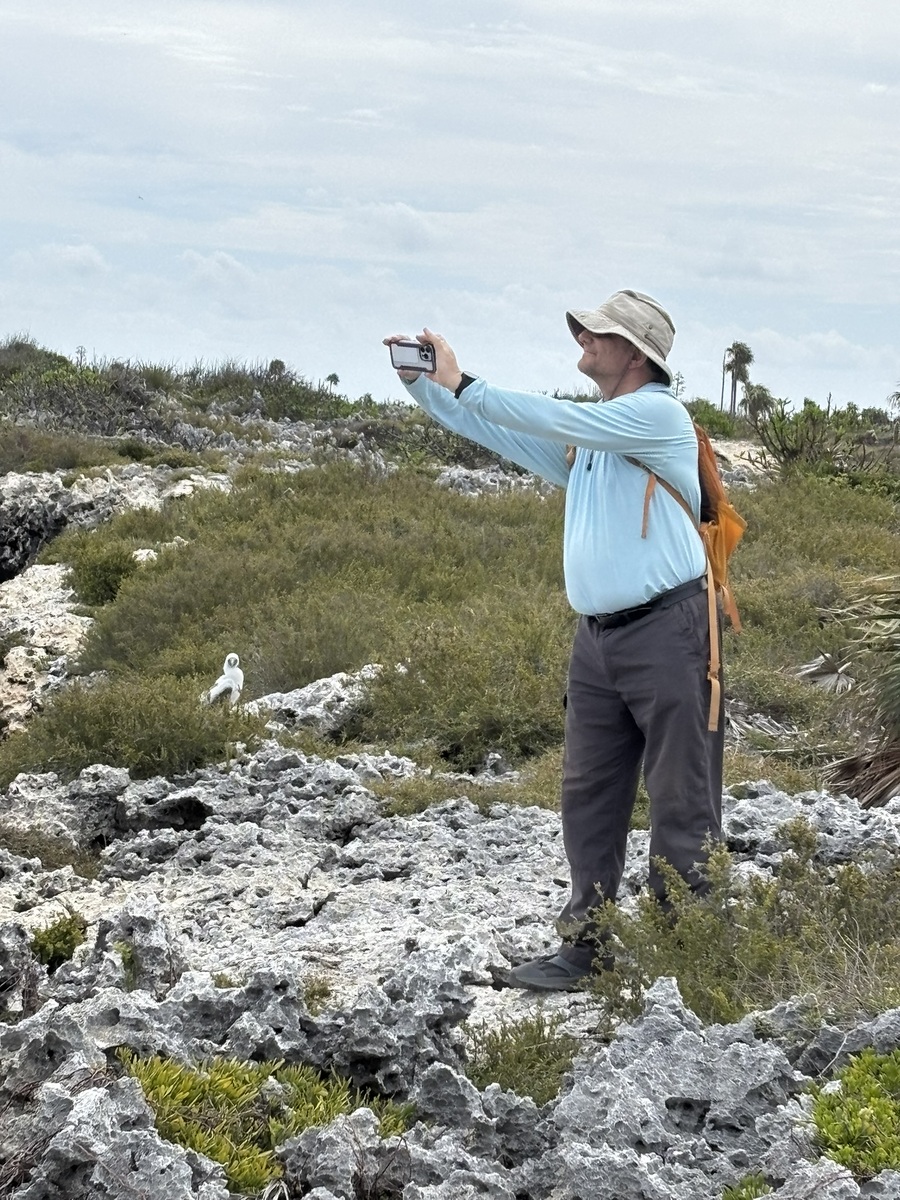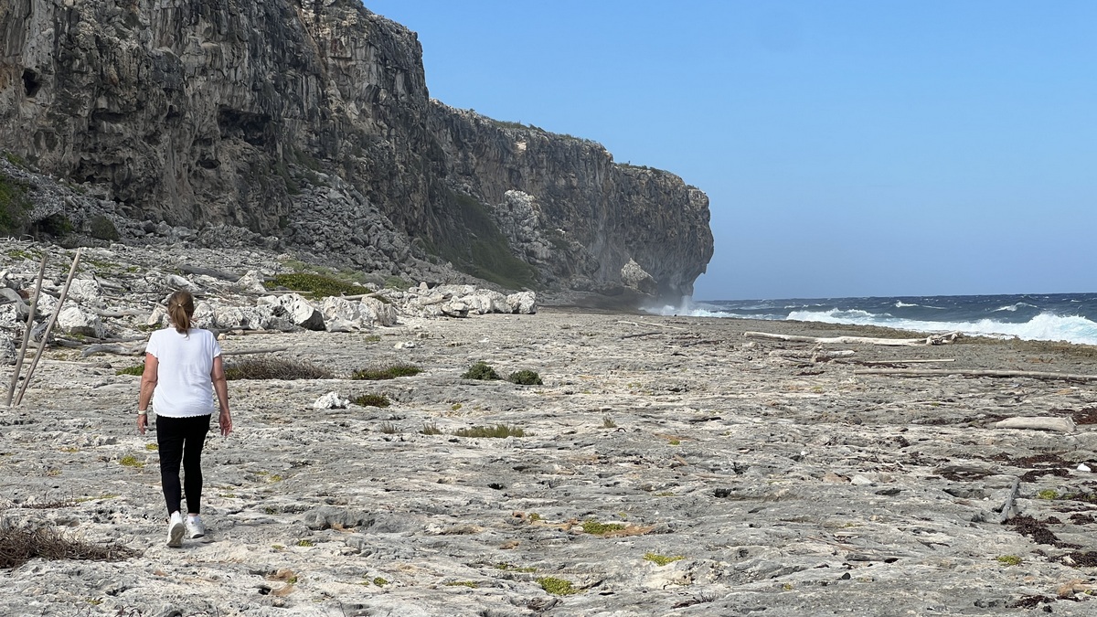 Lori encouraged us to explore Long Beach on the island’s northeast corner. The Boobies had moved from nesting on the cliff to on the beach. While the beach was as rocky as the Blowhole’s beach, it felt more exposed to the prevailing winds, and the array of plastic trash on the beach, most likely swept in from offshore, was eye-opening. At the end of the beach is a small rock, separated from the mainland, known as Little Cayman Brac, which we also saw from above while walking to the lighthouse on the top of the bluff.
