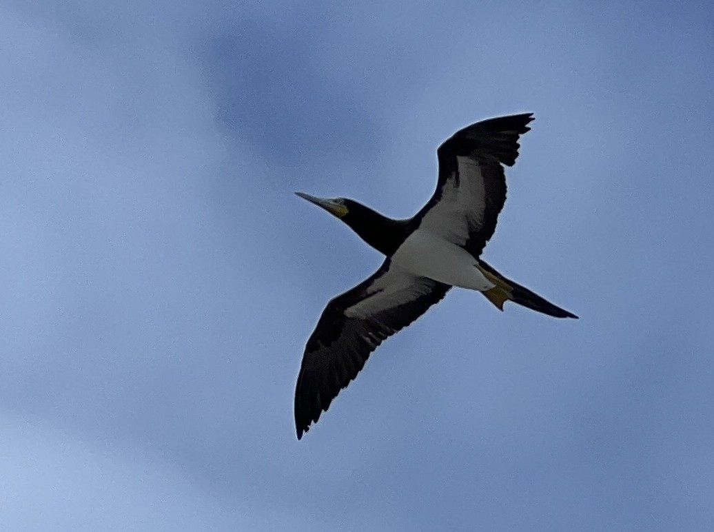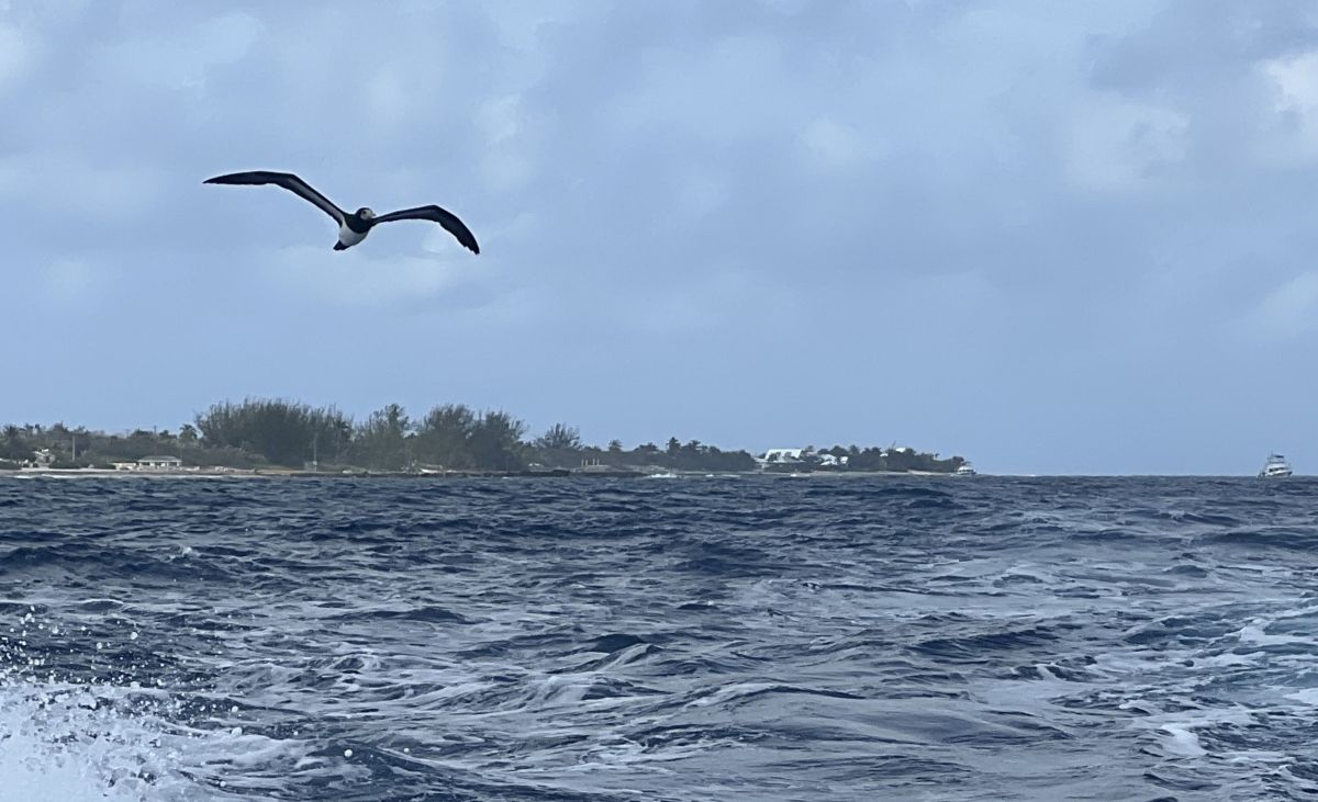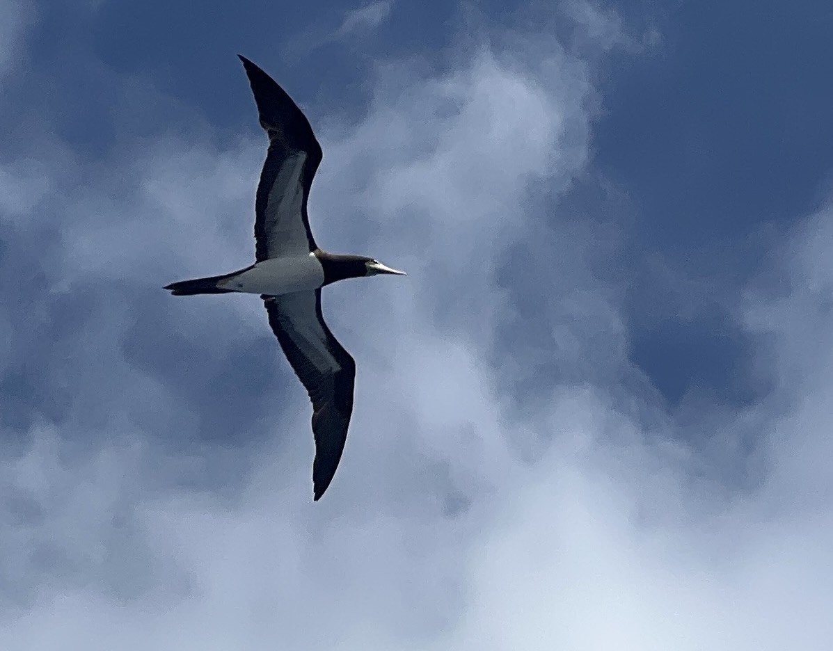Our fourth day’s diving started at Greenhouse, a site about half way along the north shore. For most of the journey to the site, a Booby followed us. We loved watching it soar over the wave crests.