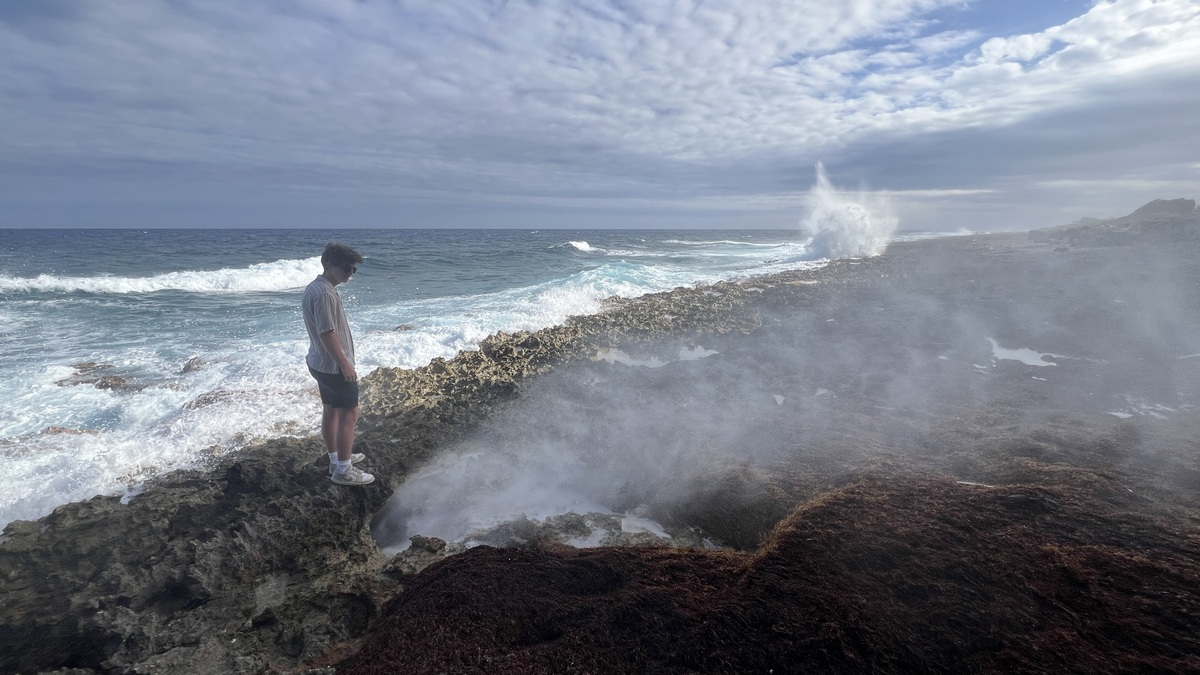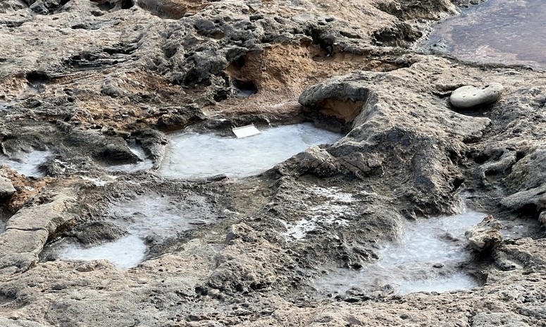 On the southern side, we also visited the Blowhole, hiking along the rocky shore as far as you can go eastwards before the beach runs out. There is a feature in the limestone pavement that causes water to shoot out as waves come in. I found the sound of air rushing through the hole fascinating, but struggled to capture it. We enjoyed seeing our first Brown Booby birds here, and I was mesmerized by the salt that had formed in some rock pools.