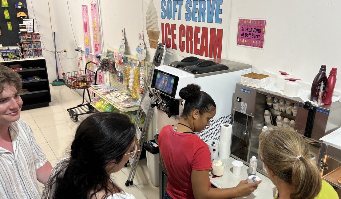 A sign offering 24 flavors of soft serve ice cream caught our eye as we drove past the Crossroads General Store after Taco Tuesday. Inside was a grocery store, like several others on the island, which sold a wide variety of goods. The list included soft serve from a remarkable machine. Watching the ice cream artist blend the ice cream was almost as satisfying as eating it!