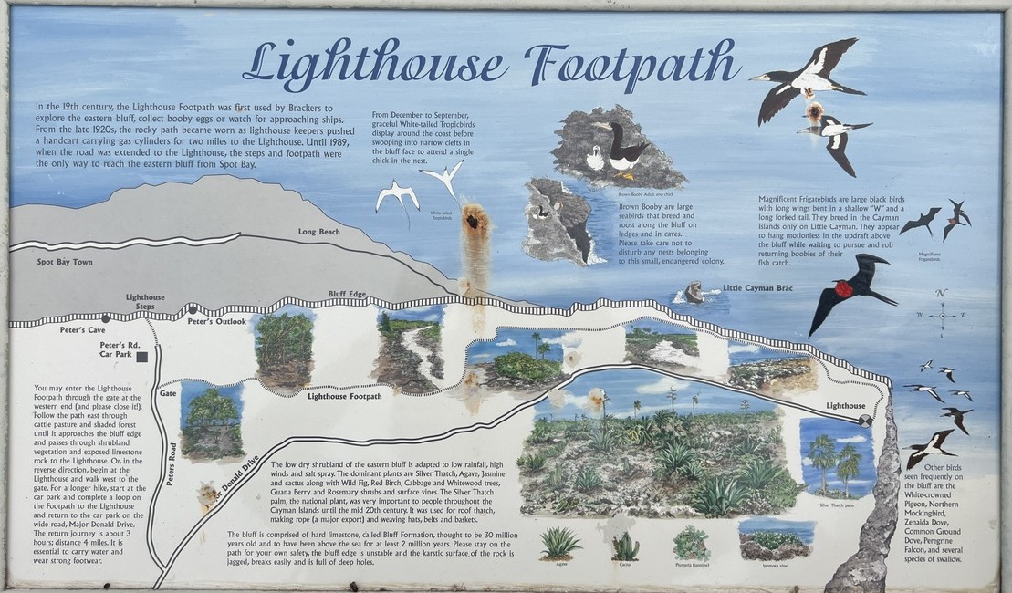 Walking along the bluff to the Lighthouse was a “must do” on our list, and it did not disappoint. It was necessary to explore the bluff to appreciate what the island was named after. We hiked the trail from our parking (by Peter’s Overlook) to the Lighthouse at the easternmost tip via the Little Cayman Brac Outlook and Booby Birds and enjoyed great views. A bonus was being swarmed by white butterflies as we hiked. We tried to keep our distance from the nesting Boobies, though I wandered a bit too close to one that I did not notice while trying to photograph Little Cayman Brac! We returned via the road as the trail had been on top of rough, sharp, vuggy limestone. Again, we were amazed that there was virtually no one else around.