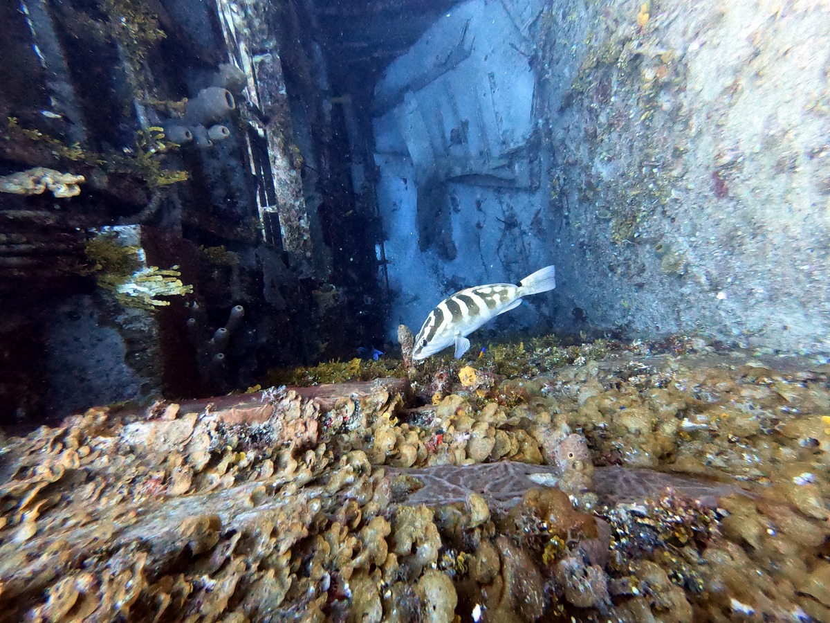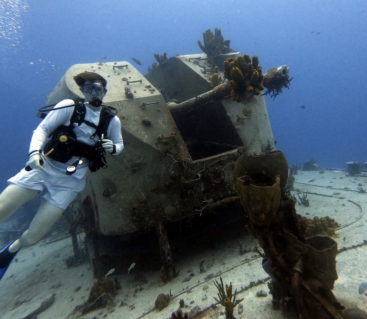 We started the third day’s diving on the MV Captain Keith Tibbetts wreck. It is the only Russian warship in the Western Hemisphere that is within recreational diving limits. The Koni 11 class frigate, designated Russian Destroyer #356, was built in 1984 in the former USSR. She served as a missile frigate based in Cuba during the Cold War. In 1992, the Soviet Republic ceased support of their Cuban naval base, and the abandoned ship was purchased by the Cayman Islands in 1996 before being intentionally sunk off Cayman Brac. It was a cool dive!