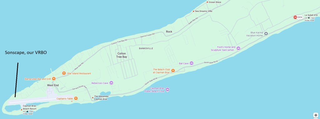 We stayed seven nights in a spacious, 3-bedroom VRBO, “Sonscape,” in Brac’s West End, on the beach near the end of the airport’s runway. We rented a car from Four D’s car rental. The near-constant 76 degF (~24 degC) and 15-20mph winds yielded a perfect temperature, though the seas were a bit choppier than ideal for water-based activities.