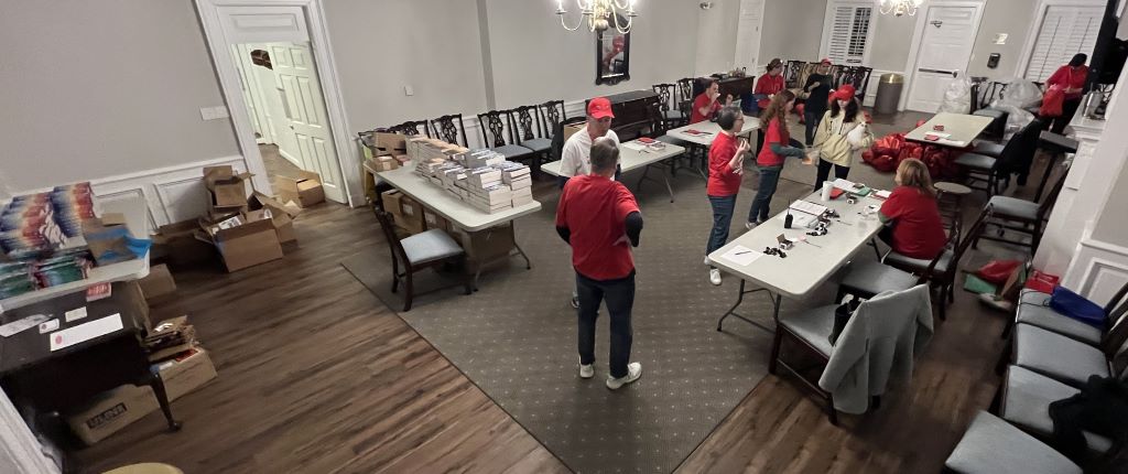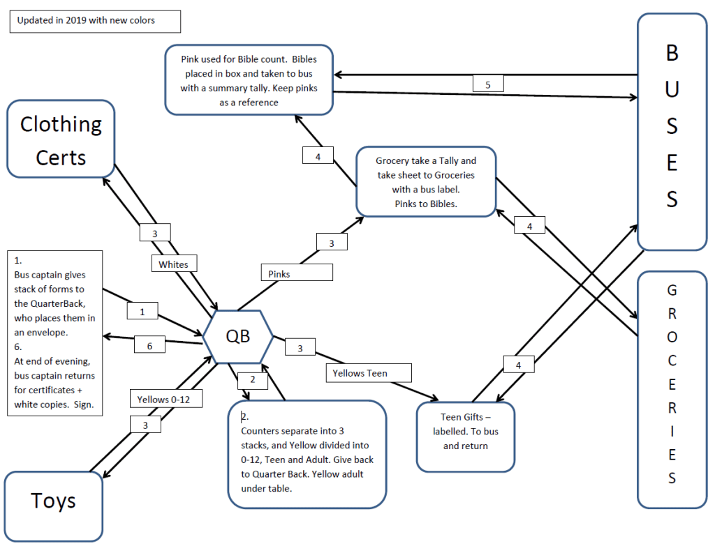 It’s also a good idea to check each “downstream” group, to ensure they are getting what they need, i.e., Toys, Clothing Certificates, and Groceries. The evening is as much about us having fun working together as it is loading the buses with goodies. Periodically checking the buses, and that they are being loaded correctly, is also good.