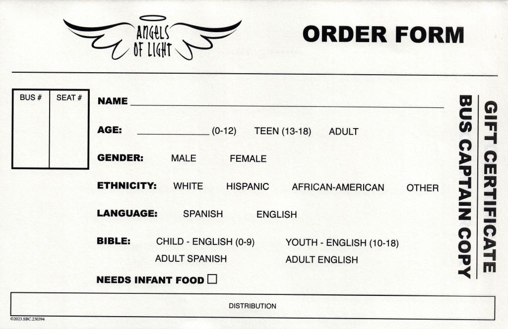 | Infant Food | Bible Story Book (English) | Youth Bible (English) | Adult Bible (English or Spanish) | Toy | Teen Gift | Clothing Certificate | Bag of Groceries | |