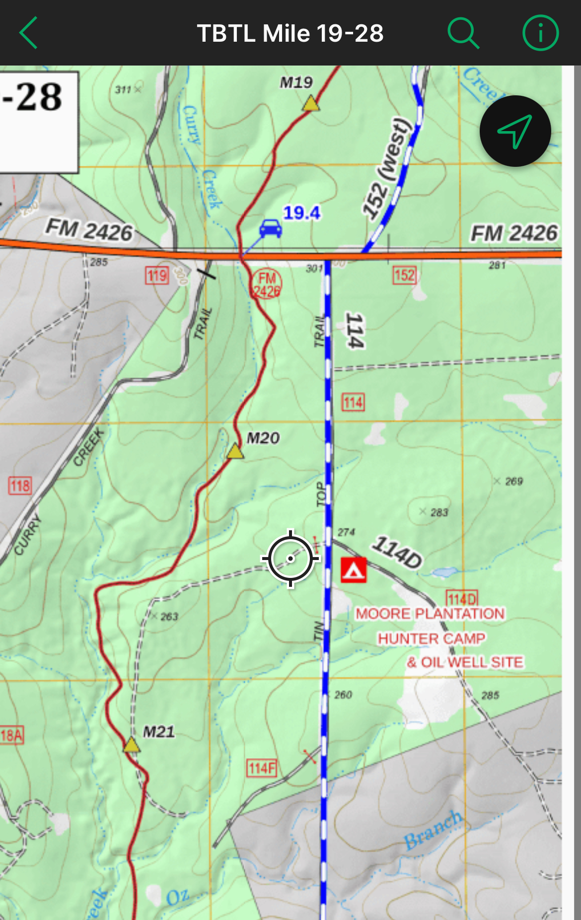 | 19.4 to 23.5 | This 4.1 mile section is the trail’s wildest, and gets the least traffic. It is a beautiful walk along Curry Creek. There is direct access from FM2426, with parking on nearby forest trails. Alternatively, there is access from the forest roads off Tin Top Trail ( FR 114). Adventurers can continue past Little Creek (23.5) after a knee-deep wade. |