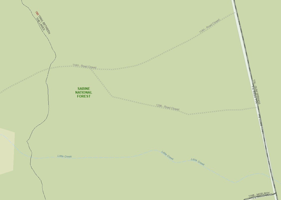 - The S. Moore Planation Hunter Camp is located off Forest Road 114 on the road labelled 1296 on the map (a little south of where the camp icon is on Avenza). This is another large site and the Forest Service Interactive Visitor Map shows that road 1296 leads to the trail. I found no evidence of a road crossing the trail as per the map but an old road crossed further south closer to Little Creek, but I did not follow it.